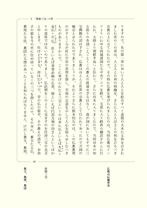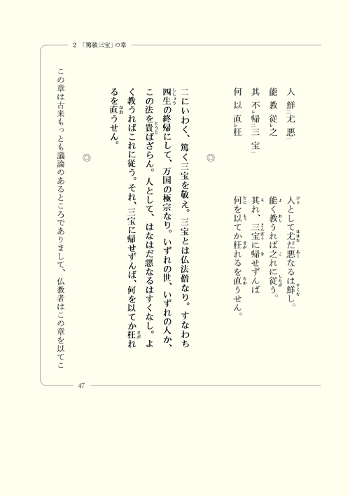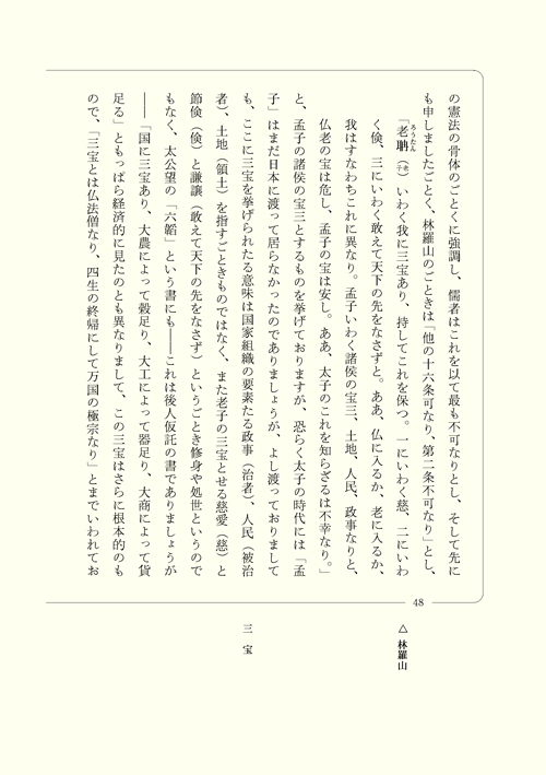 加藤咄堂 著 味読精読 十七条憲法 日本的政治倫理の源流をたずねて 王権統一国家構築の時代に記された、日本最古の理論的政治思想文書。 仏・儒・道などの諸要素が混淆した漢文文書十七条憲法の思想を、仏・儒・道の三教に詳しい著者が、典拠および関連する古典を引用しつつ字義に即して詳しく講解。 あるいは称賛され、あるいは批判されながらも、千四百年の長きにわたり語りつがれ、いまなおその命脈を保つ、日本の社会的・政治的センスの源流。 現代語訳や読み下し文だけを示す本とは違い、1)白文漢文の原文 2)返り点つきの漢文 3)読み下し文二種(漢字一対一対応のものと、ひらがな多用のもの) 4)解説文の構成による精読志向。 (加藤咄堂の他の本 『味読精読 菜根譚』 のページへ→) (加藤咄堂の他の本 『死生観』 のページへ→) |