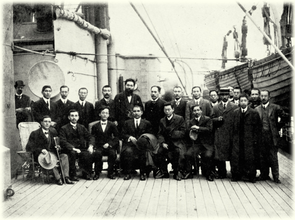辛亥革命勃発後(1911)、帰国した孫文を香港のデンバー号船上で迎えた滔天ら革命同志